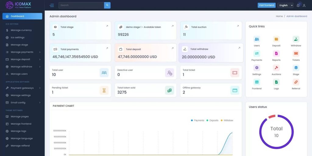 ICOMAX Token Sale & Auction Platform 是一款功能强大的数字资产交易平台,为用户提供了安全、高效的交易环境。该平台基于最新的 Laravel 8.x 框架开发,具有易于安装、多语言支持、在线/离线支付网关、KYC、电子邮件和短信验证等特色功能。此外,ICOMAX 还支持多种支付网关,包括 Razorpay、Coinpayment、Mollie Payment、NowPayments、PayStack、Flutterwave 等。用户可以使用法定货币和多种加密货币