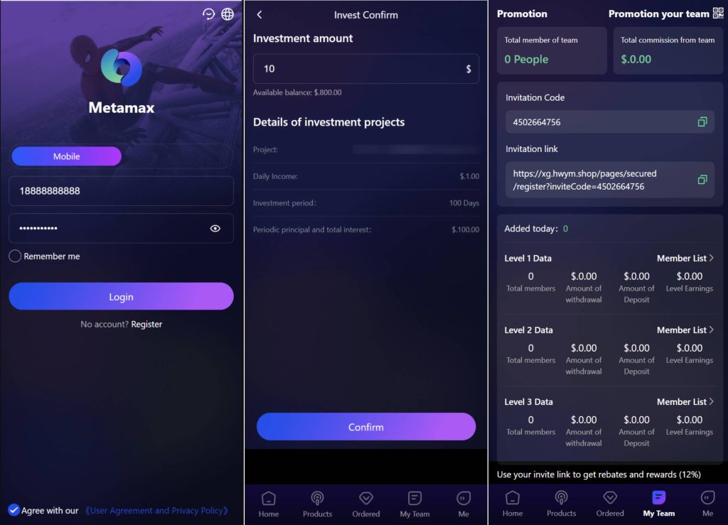 dapp区块链理财系统,支持质押挖矿、支持团队收益本项目需要在钱包中打开链接,或者浏览器安装钱包拓展插件才可以打开调用