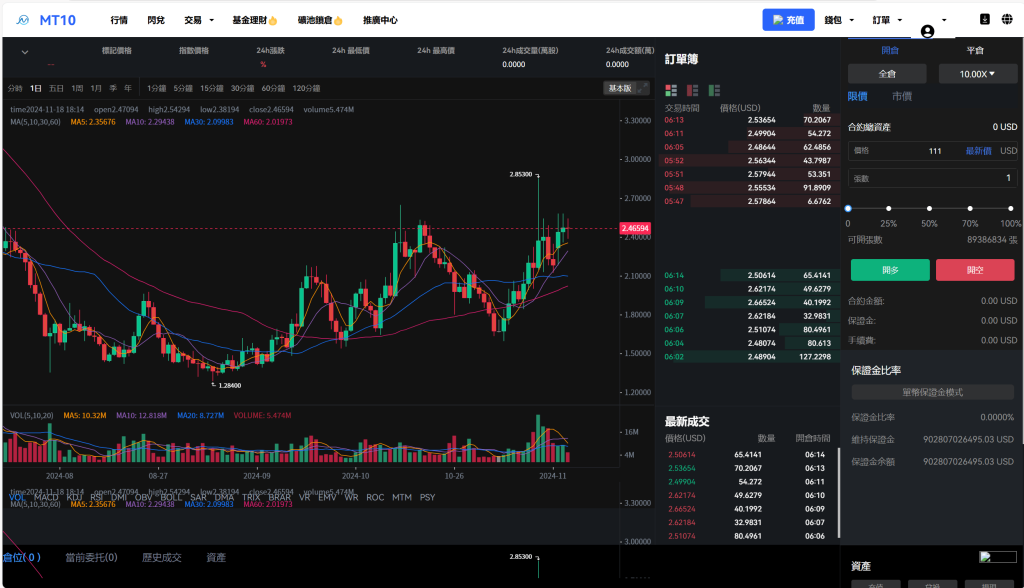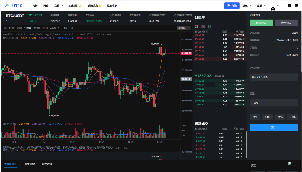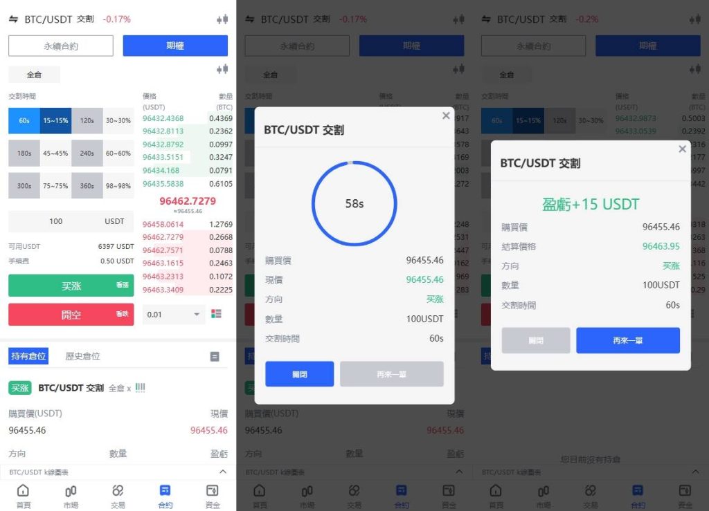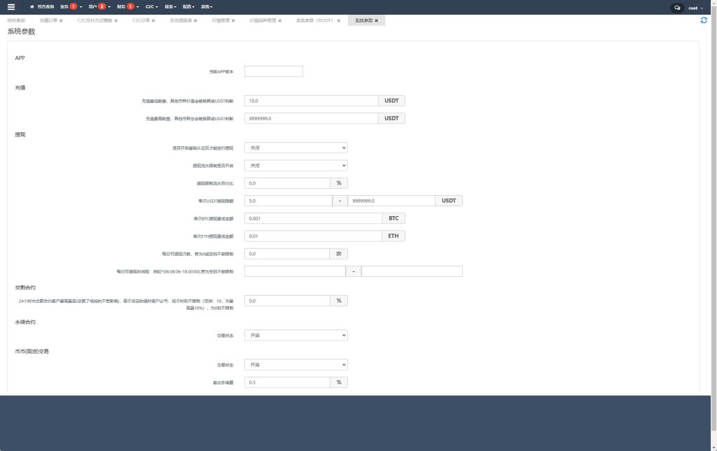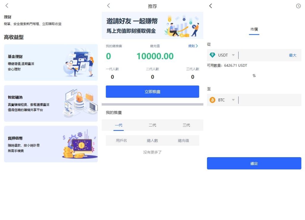 系统功能:币币交易、永续合约、期权交易、闪兑、理财、借币、邀请等功能