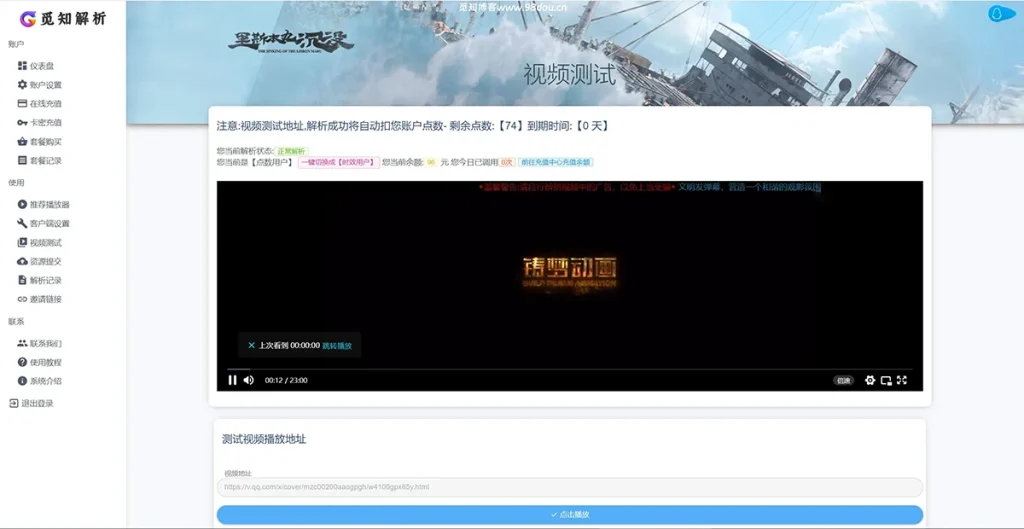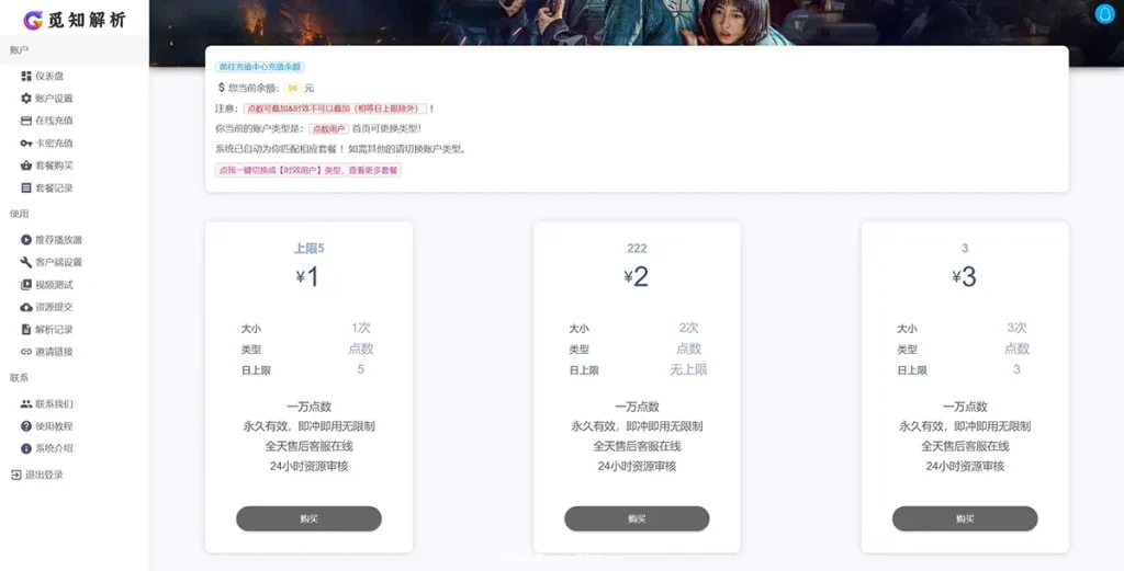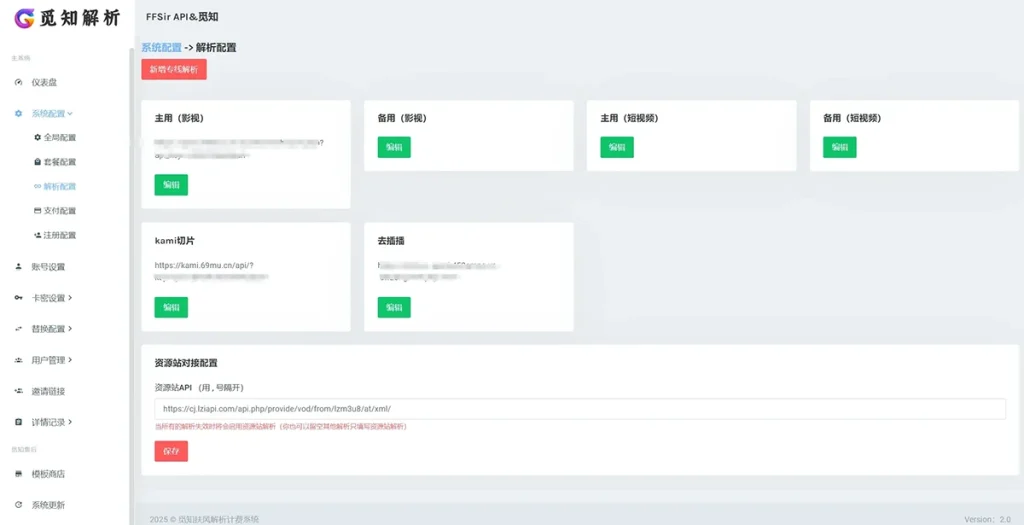 解析接口计费系统也就是多接口管理销售统计系统,可配置多接口和专用特征解析接口,有替换资源系统,对接在线支付,卡密支付,支持点数收费模式和包月套餐收费模式,管理可配置多个视频解析接口、短视频接口、备用解析等等常规功能等等!