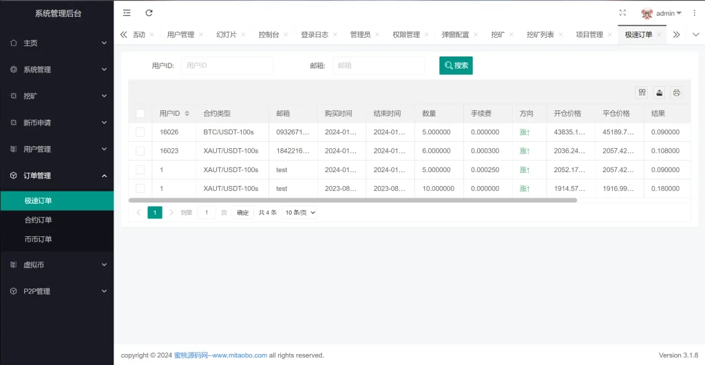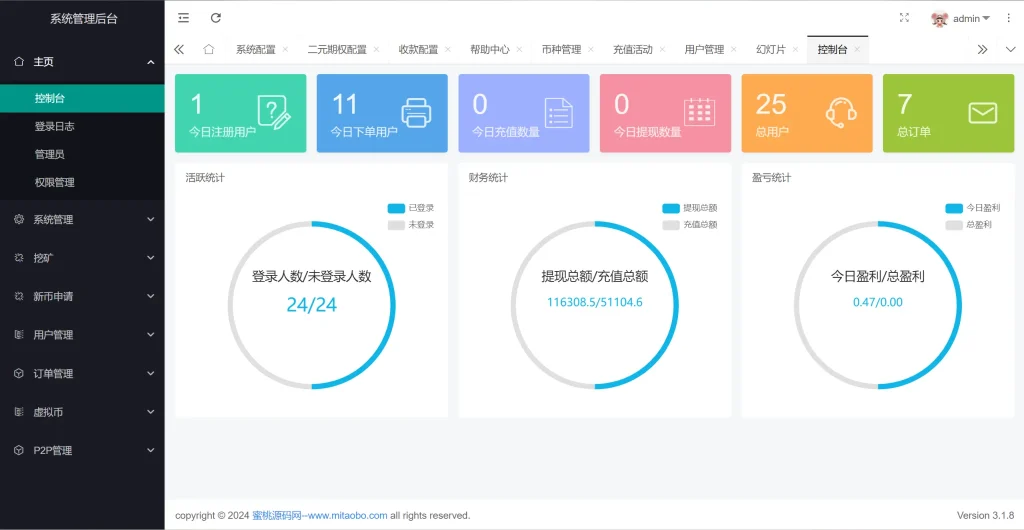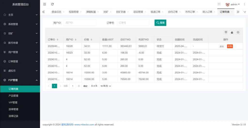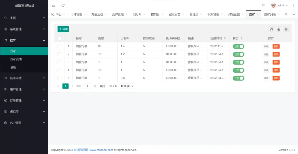 系统新增p2p理财功能、派单抢单功能,支持锁仓质押、三级分销、下单限制等功能